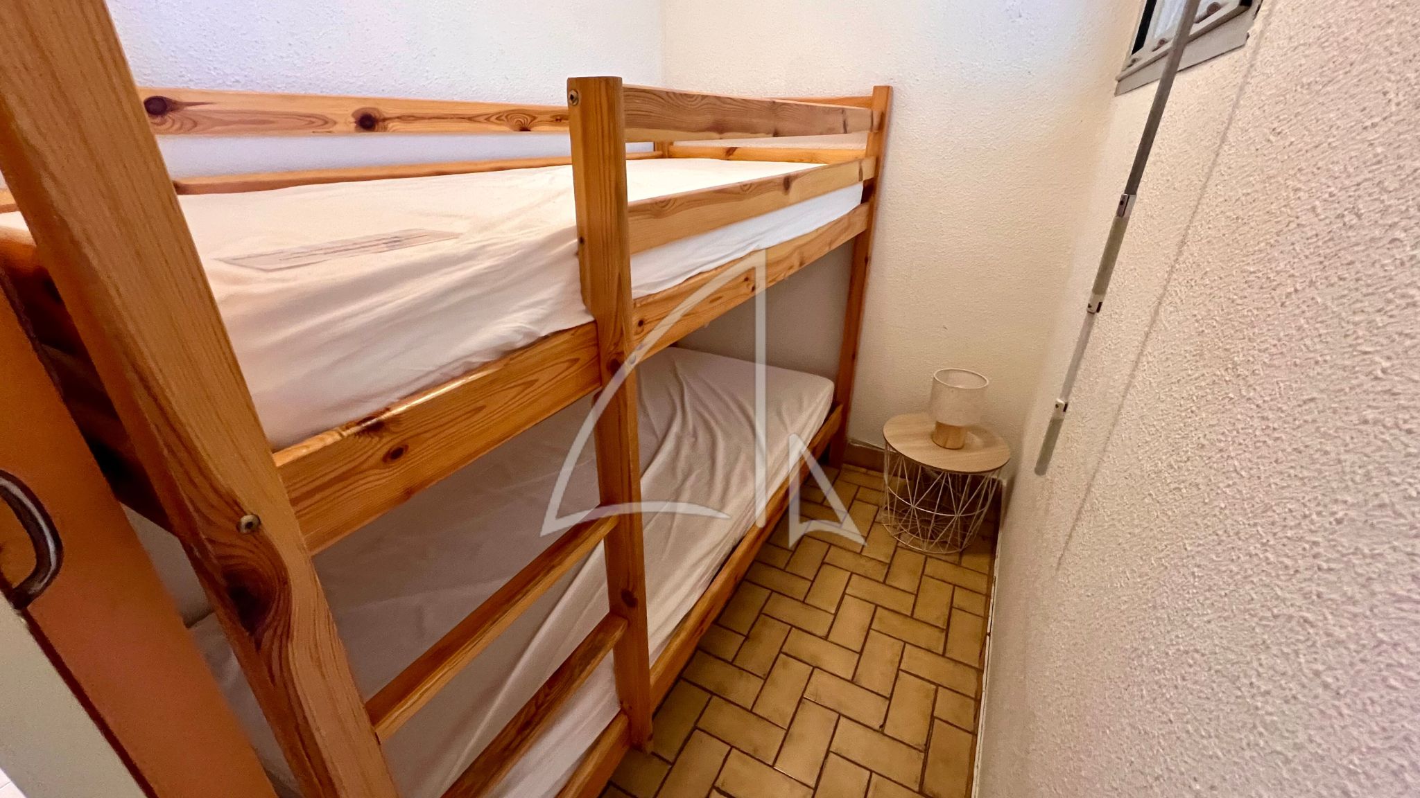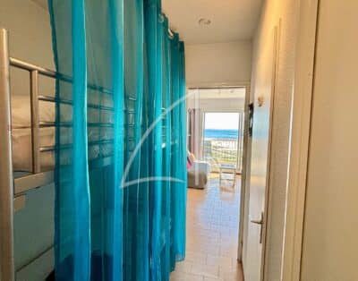 Cette location est idéale pour 2 adultes avec enfants en quête de simplicité. Elle se compose dès l’entrée d’une cabine avec lits superposés permettant le couchage de 2 enfants, d’une pièce de vie avec kitchenette équipée et canapé convertible 2 places, donnant sur une terrasse offrant une vue imprenable sur la mer. Une salle de bains et un WC indépendant complètent les commodités de l’appartement.