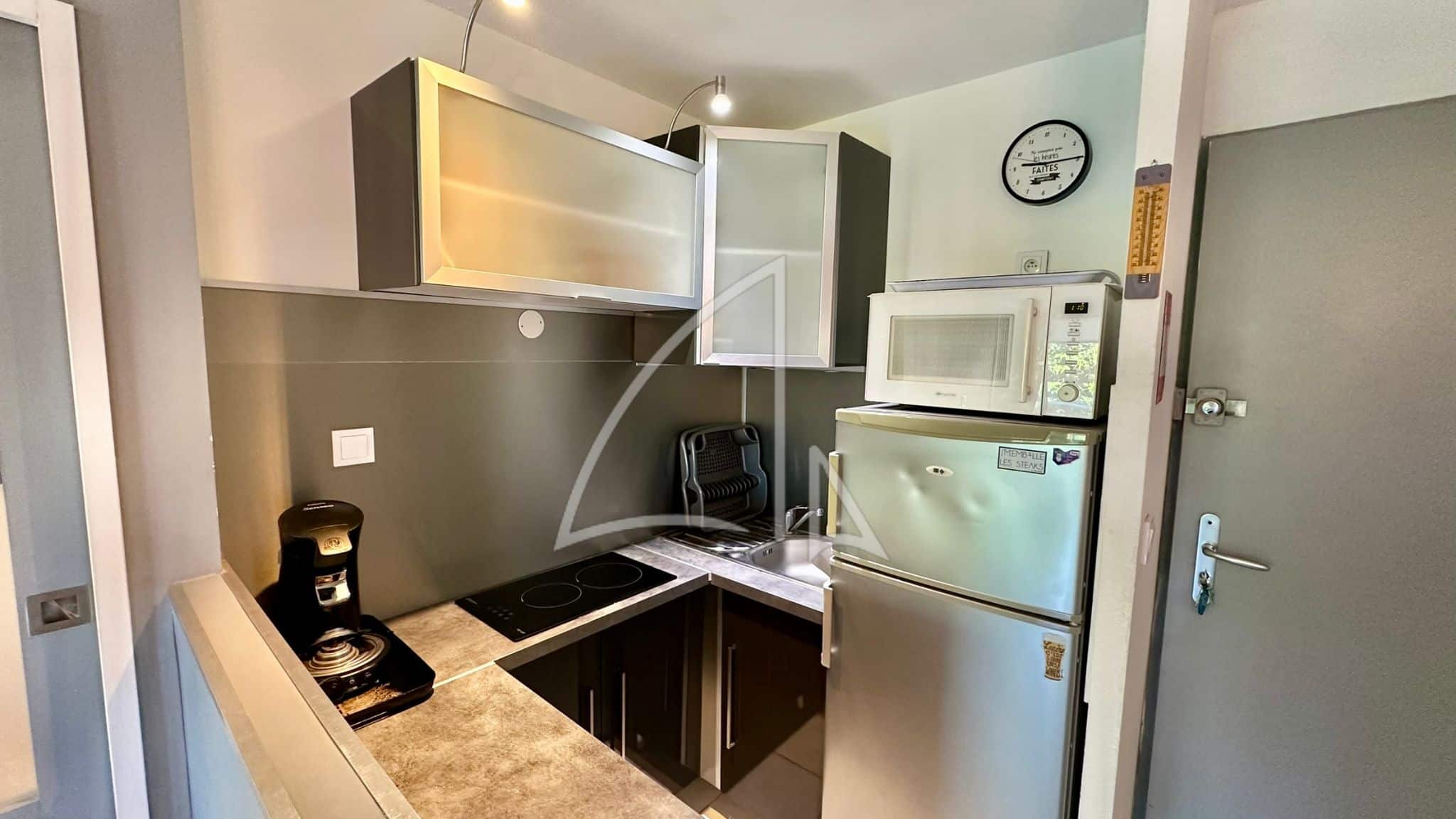 Agencé pour accueillir 2 à 4 personnes, cet espace cosy se compose d’une pièce de séjour climatisée avec kitchenette équipée donnant sur une loggia offrant une vue paisible sur l’arrière de la résidence. Une cabine propose un espace nuit aménagée d’un lit en 140 et d’un placard qui conviendra parfaitement à deux adultes. Un dégagement mène à une salle d’eau et à un WC indépendant pour plus d’intimité.