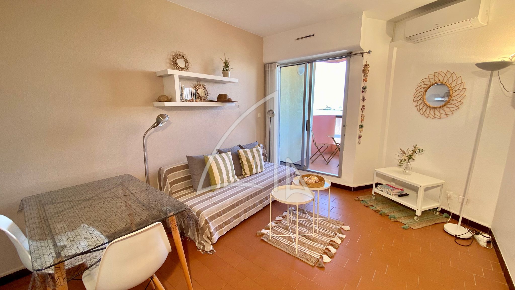 Dès l’entrée, vous retrouverez un espace cuisine moderne, donnant sur une pièce de vie climatisée à l’esprit plage donnant sur une terrasse avec vue sur la mer, vous invitant ainsi à la détente. Une salle de bains avec WC vient compléter cet espace intimiste.